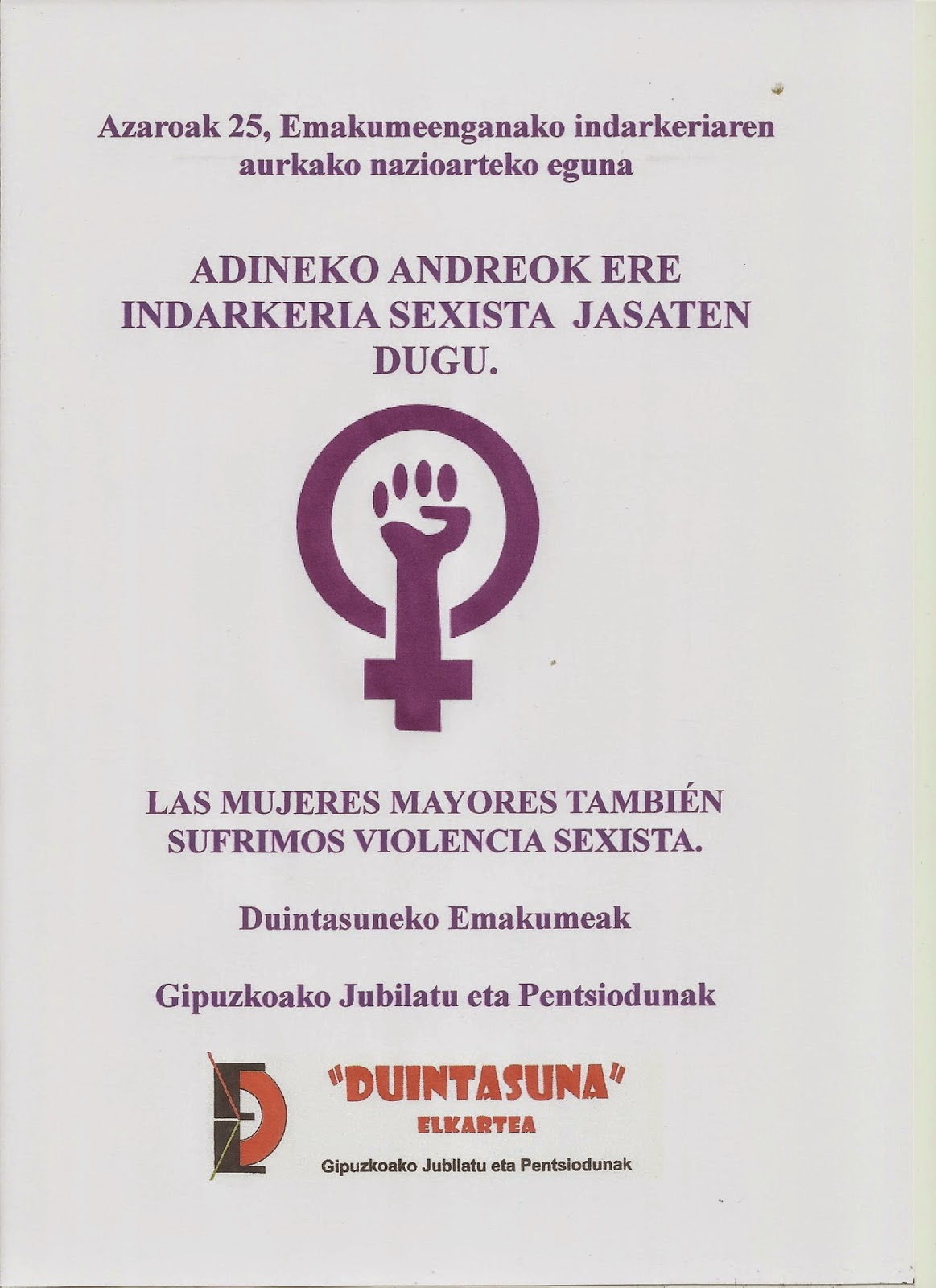 DUINTASUNA plataformako emakumeon kolektiboak ankerkeria honen aurka borrokatzen duten pertsonekin bat egin nahi du. Horrez gain, zera salatu nahi dugu: adineko emakume askok, jasotzen dituzten miseriazko pentsioak direla medio, jasaten dituen prekarietate egoerak, pobrezia eta utzikeria. Emakumeen heren batek baino gehiagok 300 eta 600 € arteko pentsioak dituzte. Honi guztiari erantsi behar zaio, TXIROTASUN EGOERAN bizitzera behartzen dituela zerbitzu eta laguntza publikoen urritasunak.