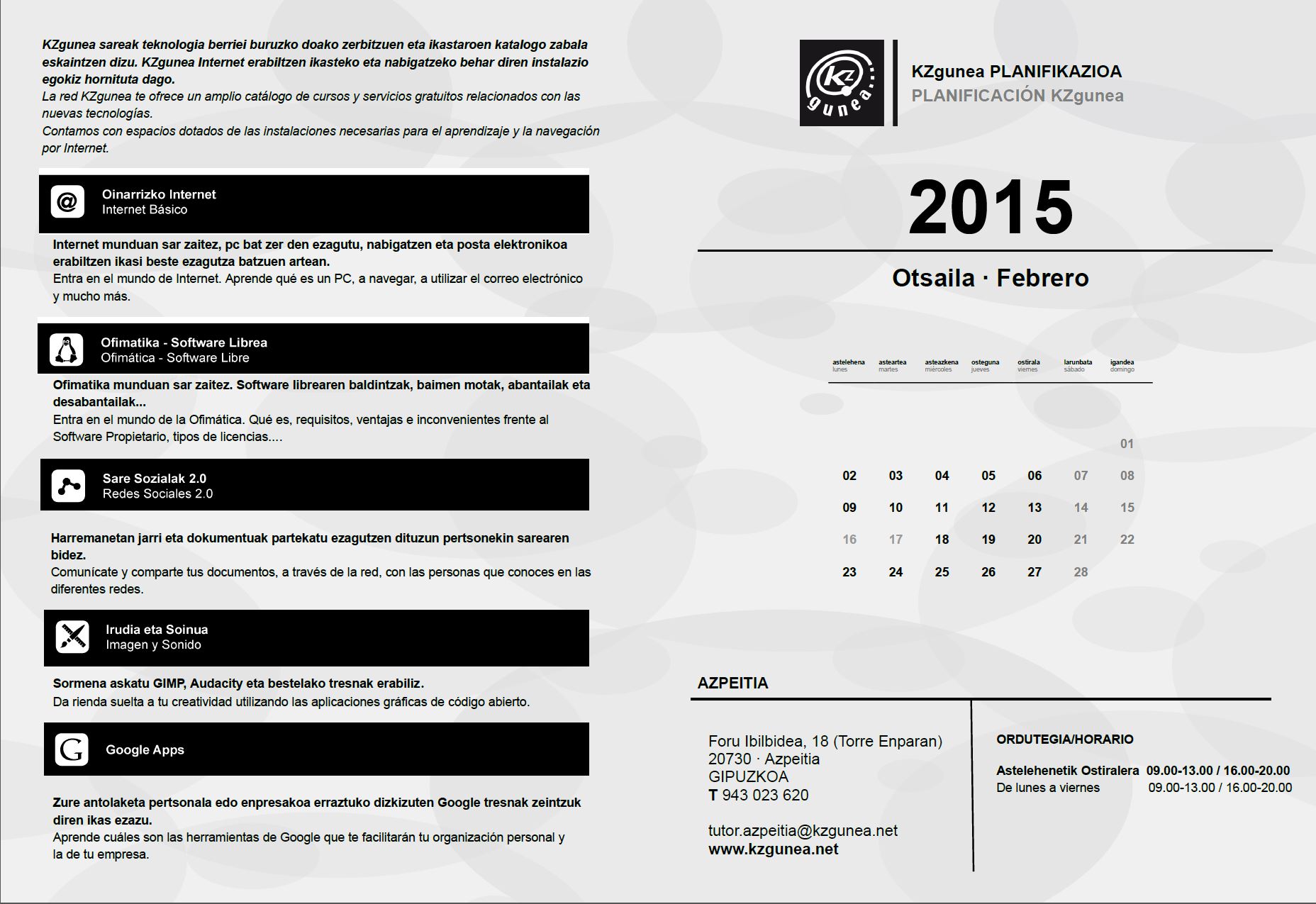 Informatika ikastaroa On otsaila 5, 2015otsaila 5, 2015 By webaigeraIn Kategoriarik gabe,Kultura KZgunean informatika ikastaroa hastear dago, ea animatzen geran, kanpoan hotz eta giro txarra dagoen bitartean. Hau da bertako egutegia eta programa. Haunditzeko egin klik irudien gainean. Partekatu hau: Share on X (Opens in new window) X Share on Facebook (Opens in new window) Facebook Atsegin dut Kargatzen... Related