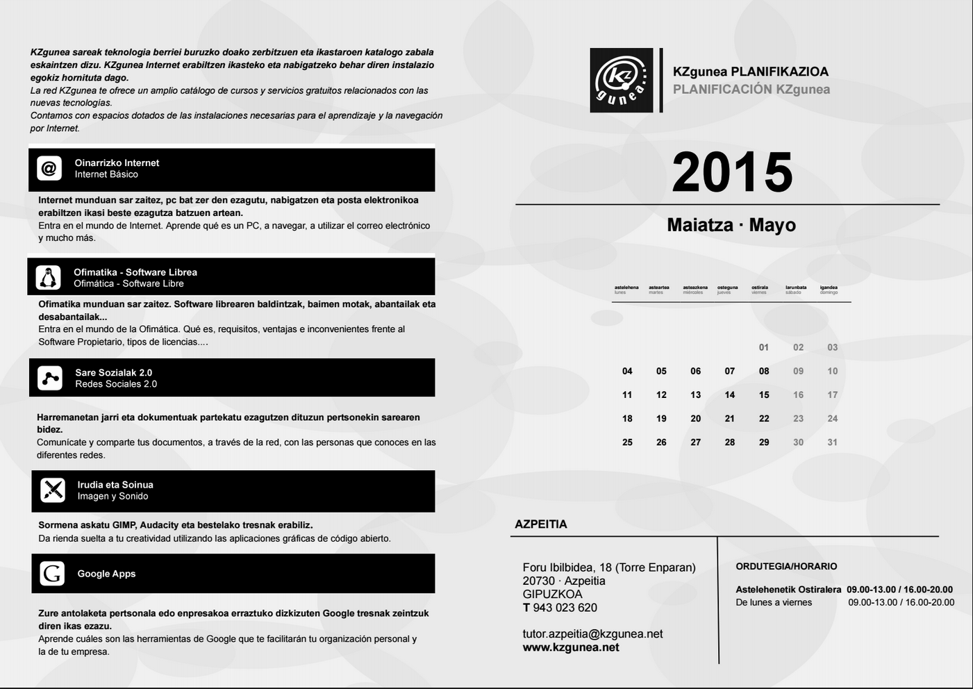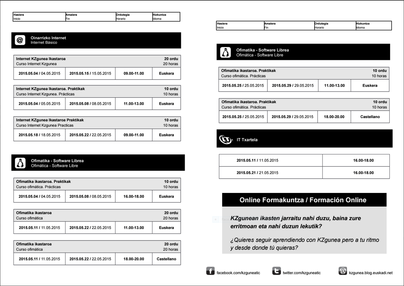 KZguneko maiatzeko ikastaroak. On apirila 20, 2015 By webaigeraIn Kategoriarik gabe KZgunean maiatzean izango diren ikastaroak. Erne ibili eta izena eman lehenbaitlehen. Handitzeko egin gainean klik. Partekatu hau: Share on X (Opens in new window) X Share on Facebook (Opens in new window) Facebook Atsegin dut Kargatzen... Related