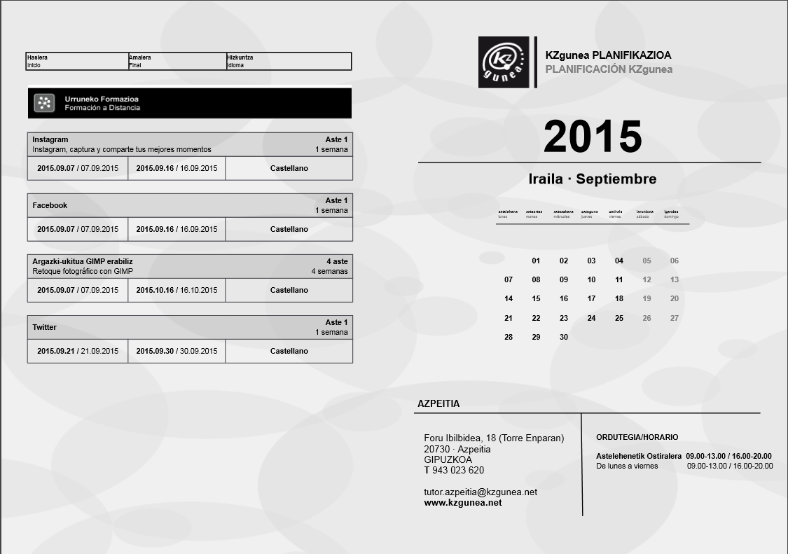 KZguneko Iraileko ikastaroak On abuztua 20, 2015 By webaigeraIn Kategoriarik gabe Oporrak pasatu ondoren, indarberrituta, animatu ikastaroak egitera. Haunditzeko egin gainean Klik Partekatu hau: Share on X (Opens in new window) X Share on Facebook (Opens in new window) Facebook Atsegin dut Kargatzen... Related