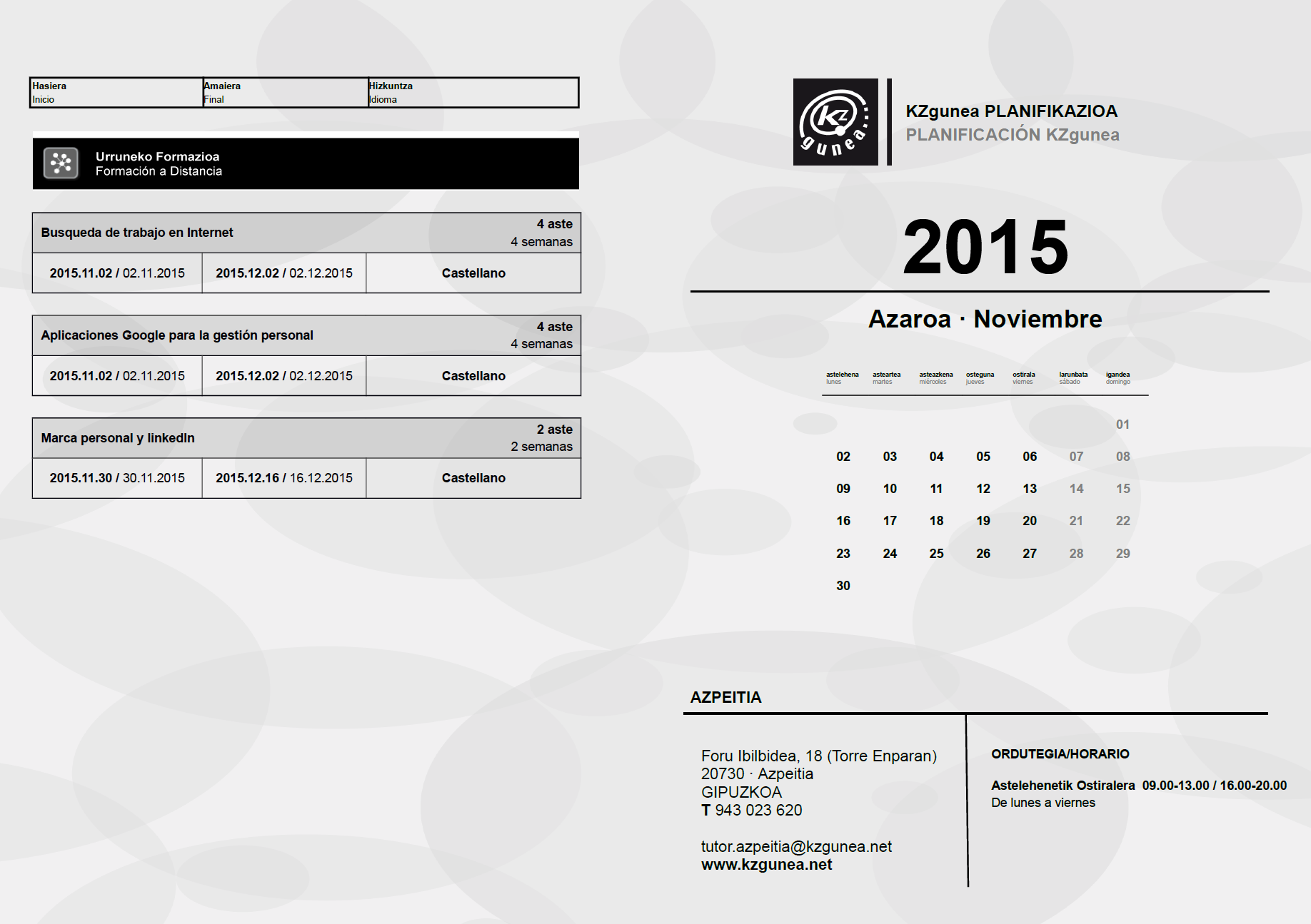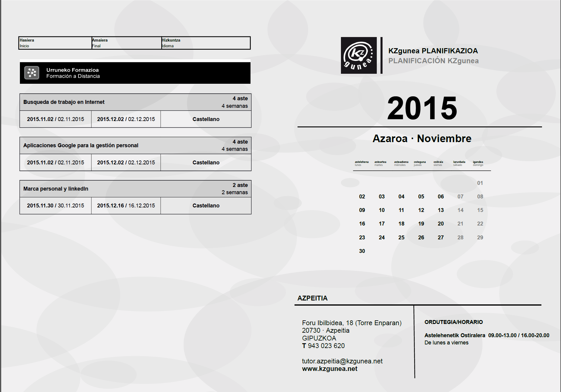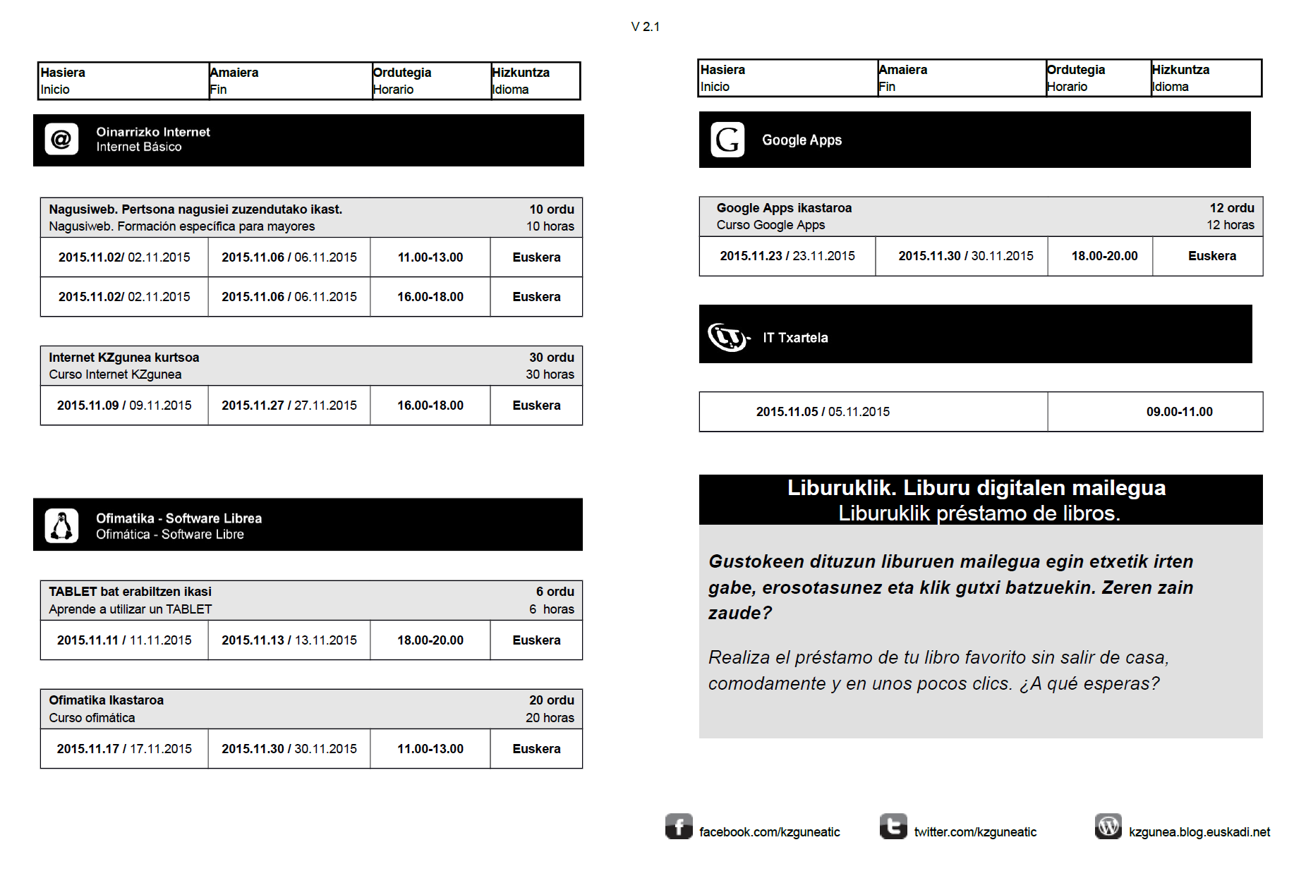 KZguneko urria eta azaroko ikastaroak On Iraila 28, 2015Iraila 28, 2015 By webaigeraIn Kategoriarik gabe,Kultura Hemen dituzue, urrian eta azaroan KZgunean izango diren ikastaroak. Denbora pasa, epelean ikastaroak egiteko aukera. Aprobetxatu!! Haunditzeko egin klik gainean. Partekatu hau: Share on X (Opens in new window) X Share on Facebook (Opens in new window) Facebook Atsegin dut Kargatzen... Related