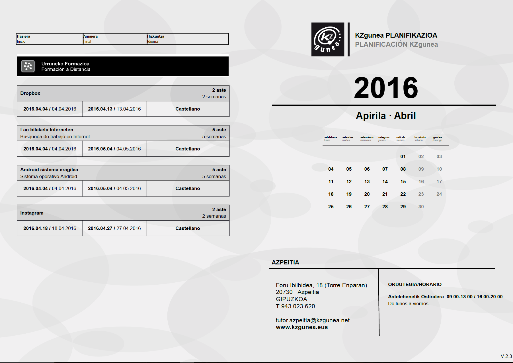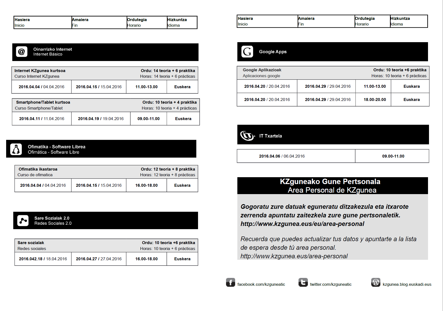 KZguneko apirileko ikastaroak. On martxoa 4, 2016 By webaigeraIn Kategoriarik gabe Hemen duzue, KZgunean apirilean egingo diren ikastaroen zerrenda. Animo eta ikastera!!! Haunditzeko egin zerrendaren gainean klik. Partekatu hau: Share on X (Opens in new window) X Share on Facebook (Opens in new window) Facebook Atsegin dut Kargatzen... Related