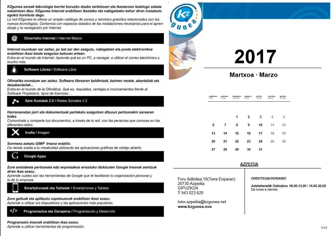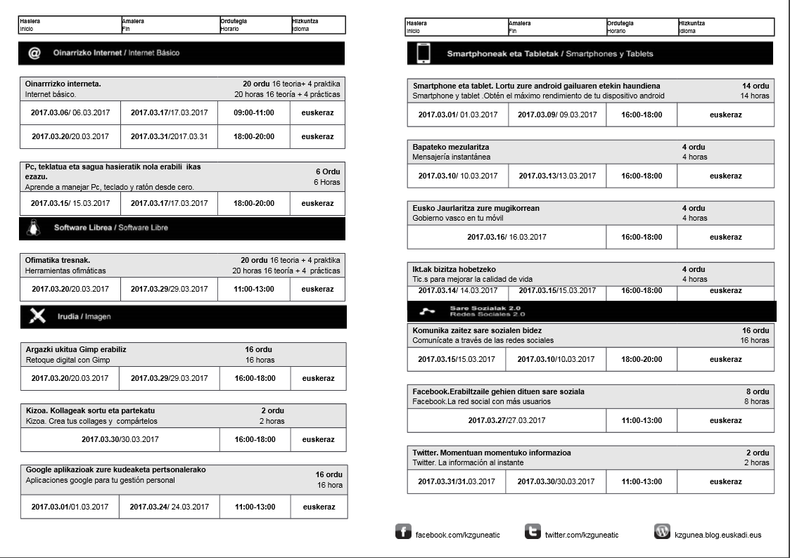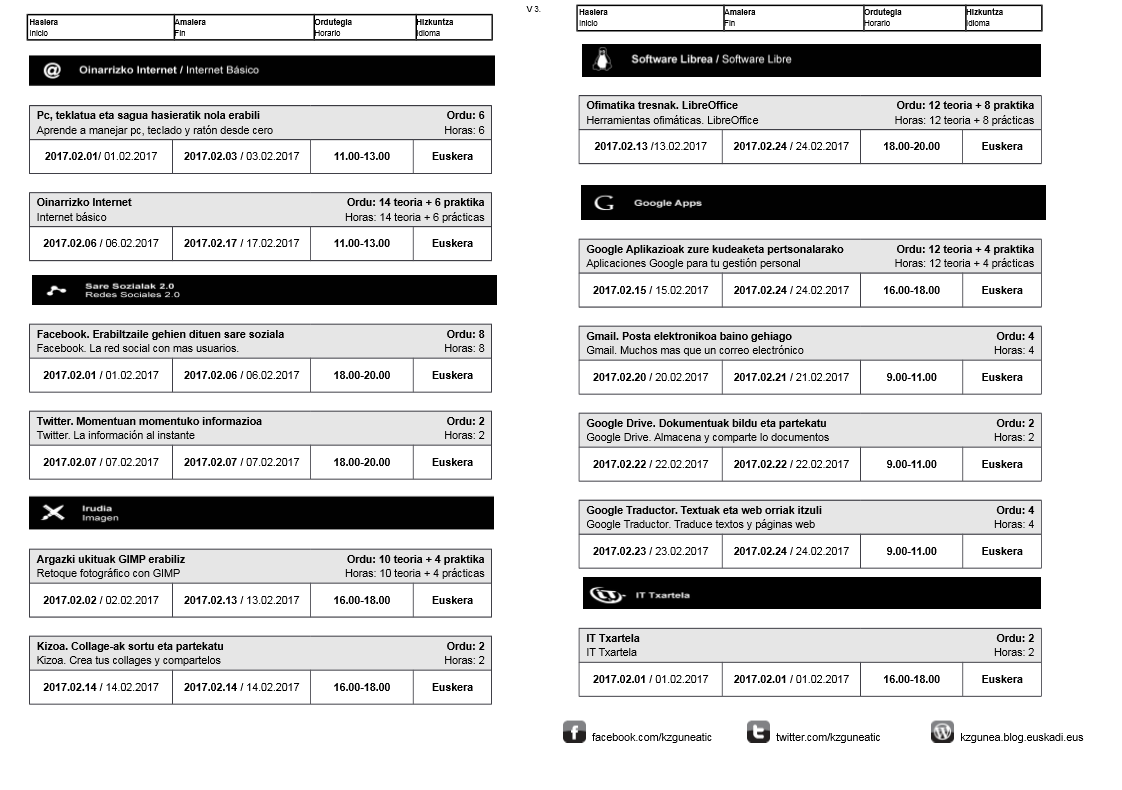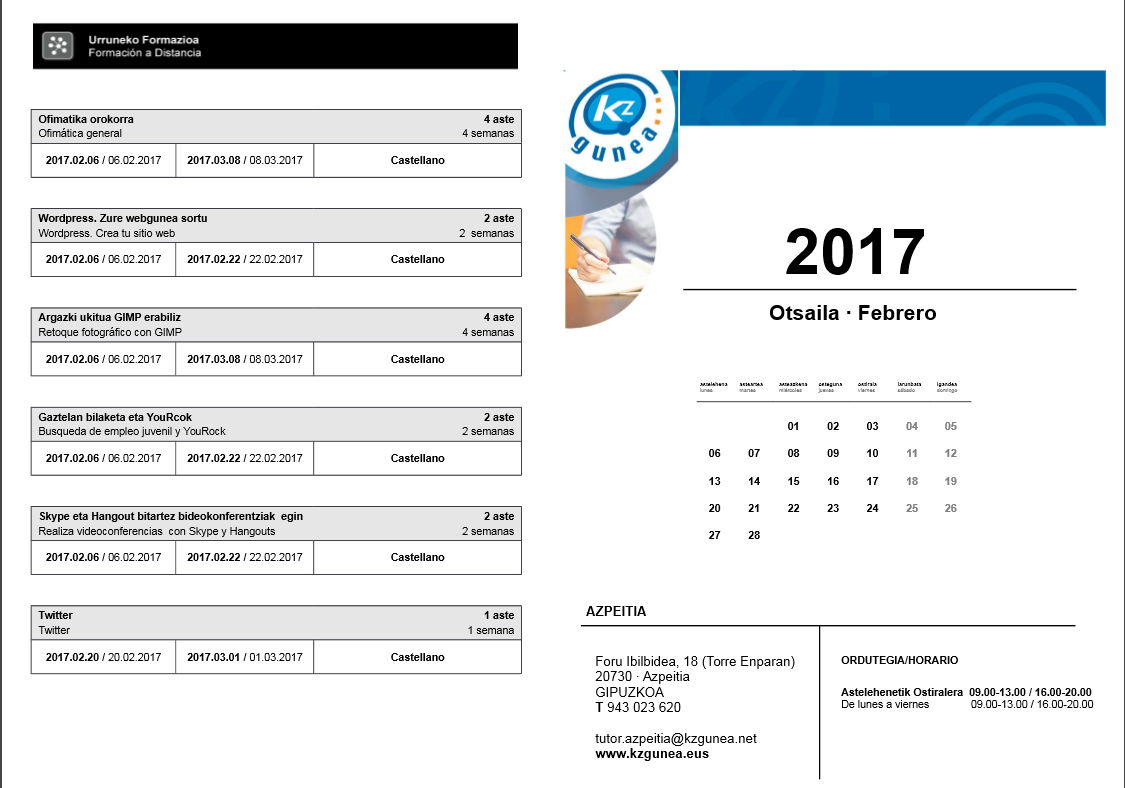 KZguneko otsaileko eta martxoko ikastaroak. On urtarrila 31, 2017 By webaigeraIn Kategoriarik gabe Ondorengo ikastaro hauek dituzue otsailean eta martxoan KZgunean izango dituzuenak. Animo!! eta izena eman. Haunditzeko egin gainean klik. Partekatu hau: Share on X (Opens in new window) X Share on Facebook (Opens in new window) Facebook Atsegin dut Kargatzen... Related