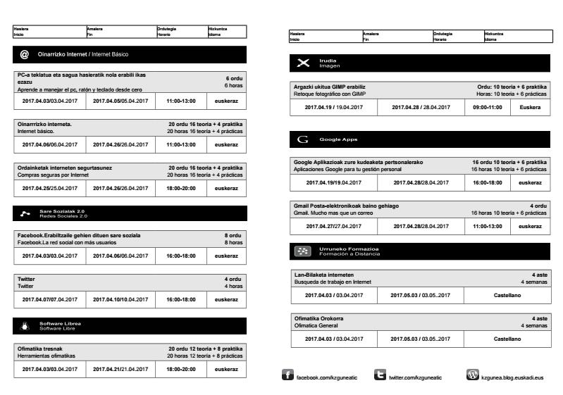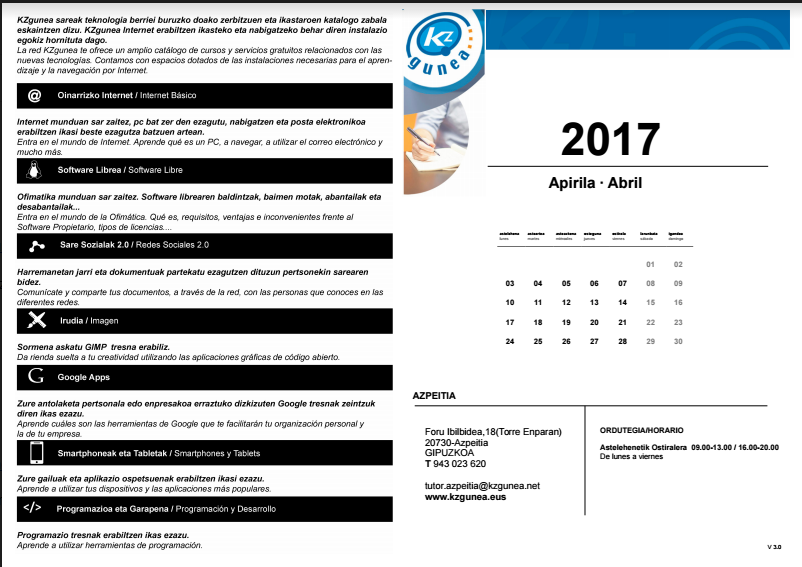 KZguneko Apirileko ikastaroak On martxoa 4, 2017 By webaigeraIn Kategoriarik gabe Hemen duzue Kzgunean Apirilean izango dituzuen ikastaroen zerrenda. Animatu Udaberriarekin batera!!! Haunditzeko egin gainean klik. Partekatu hau: Share on X (Opens in new window) X Share on Facebook (Opens in new window) Facebook Atsegin dut Kargatzen... Related