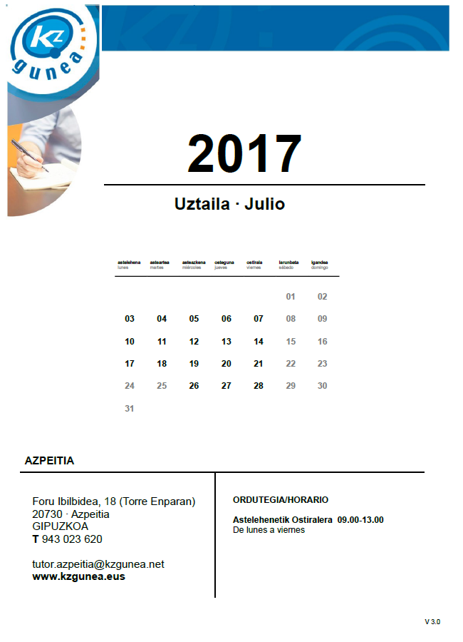 Azpeitiko Kzgunean Uztailan egongo diren ikastaroen planifikazioa bidaltzen dizugu.