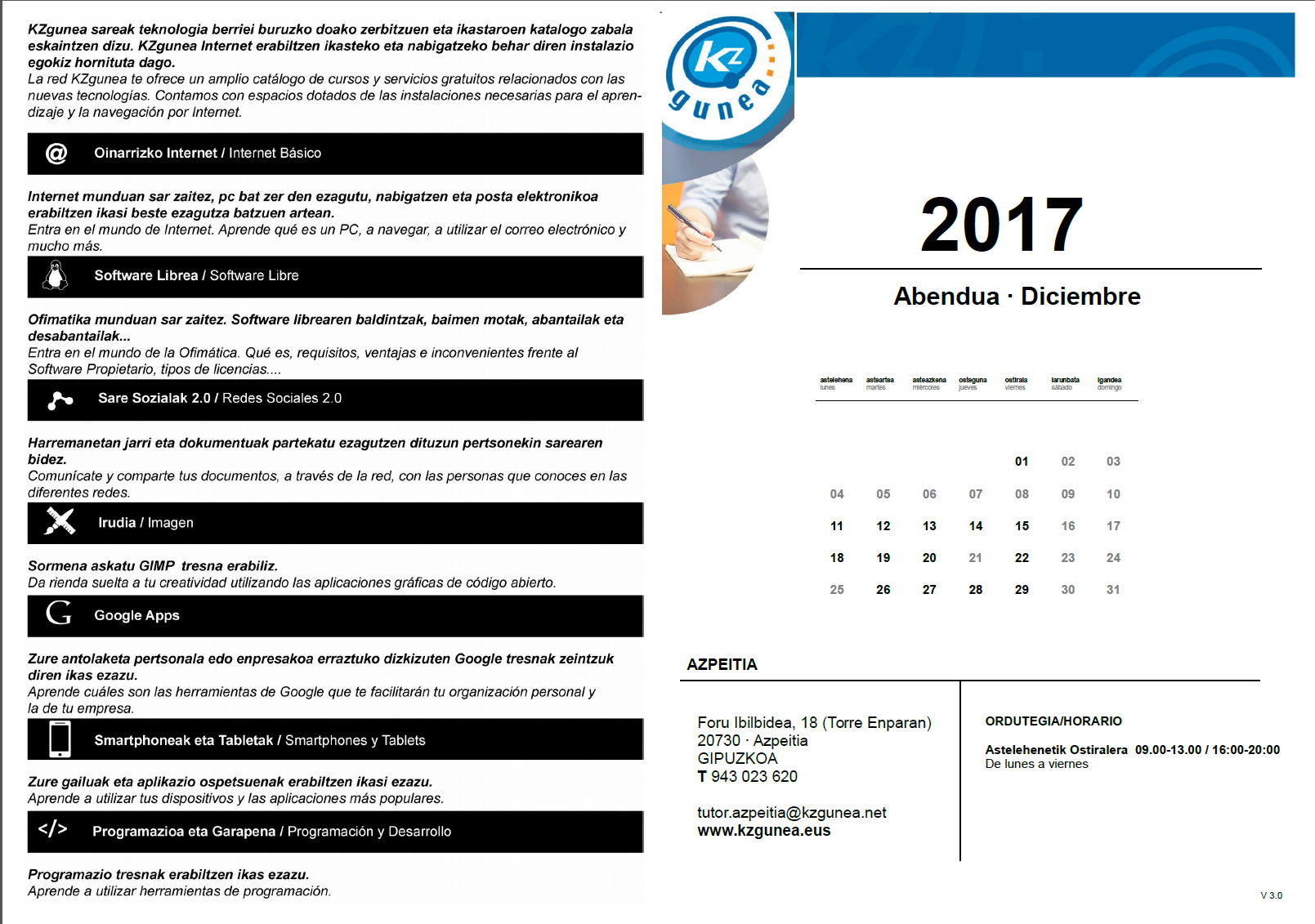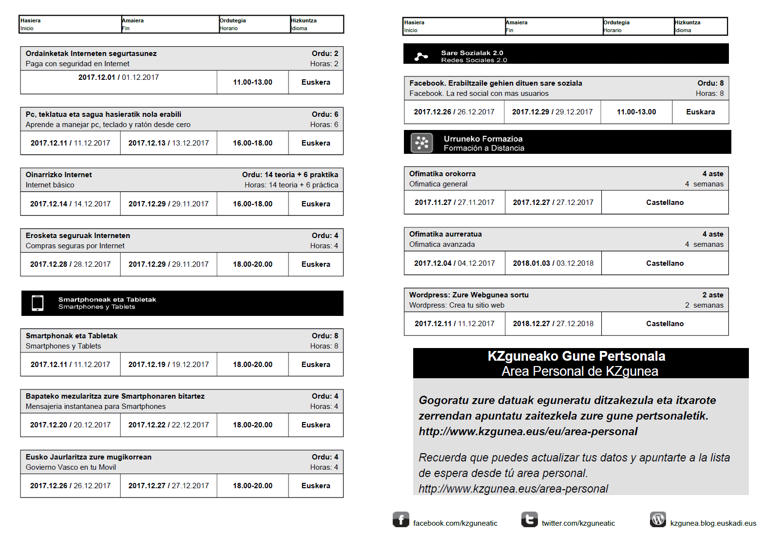 KZguneko abenduko ikataroak On azaroa 27, 2017azaroa 27, 2017 By webaigeraIn Kultura Hemen dituzue KZgunean abenduan izango diren ikastaroak. Kanpoko hotzei aldeginaz, epelean ikasteko animatu!! Haunditzeko egin gainean klick. Partekatu hau: Share on X (Opens in new window) X Share on Facebook (Opens in new window) Facebook Atsegin dut Kargatzen... Related